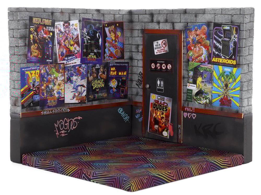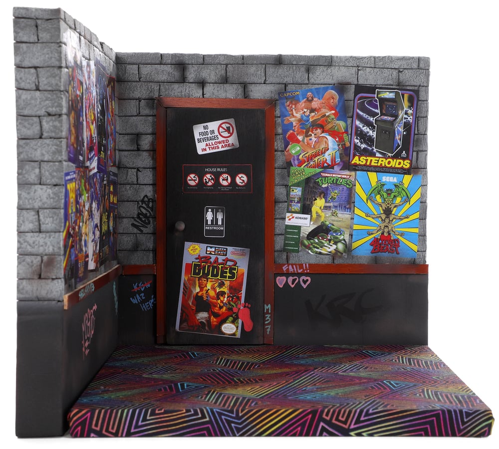 A three panel modular diorama with magnetic walls for quick assembly and easy storage. This diorama is handcrafted (so each one will slightly vary) but what you see, is approximately what you will get (posters and all). Figures and arcade cabinets are for demonstration only and will not be included.